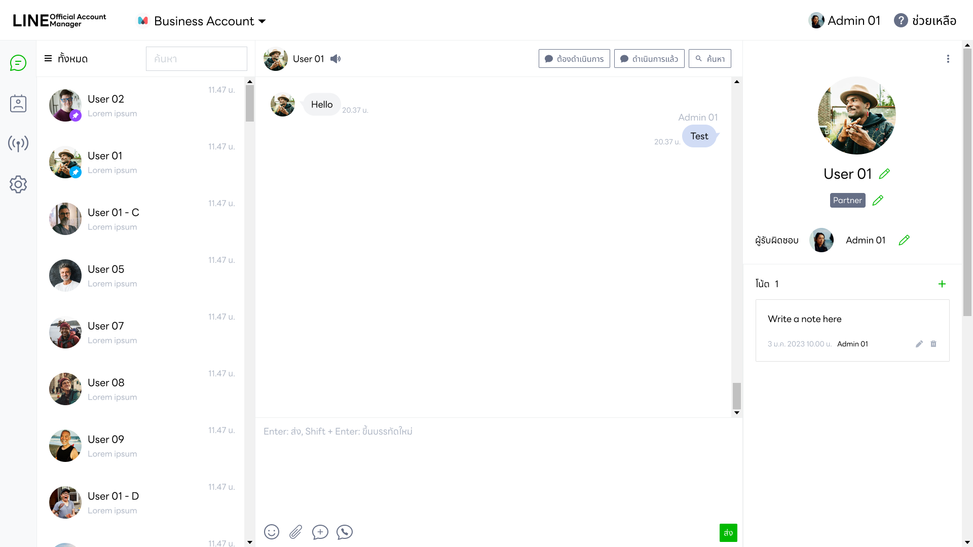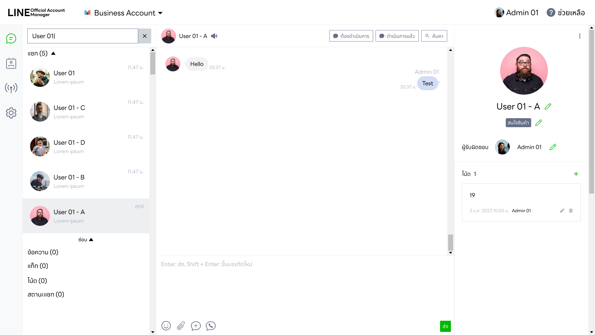 ใน LINE OA จะสามารถค้นหา ค้นหาชื่อ / ค้นหาข้อความ / ค้นหาแท็ก แต่จะไม่สามารถค้นหาโน้ตได้ ซึ่งใน LINE OA จะมีฟังก์ชันโน้ต สำหรับเขียนโน้ตของลูกค้าแต่ละคนได้