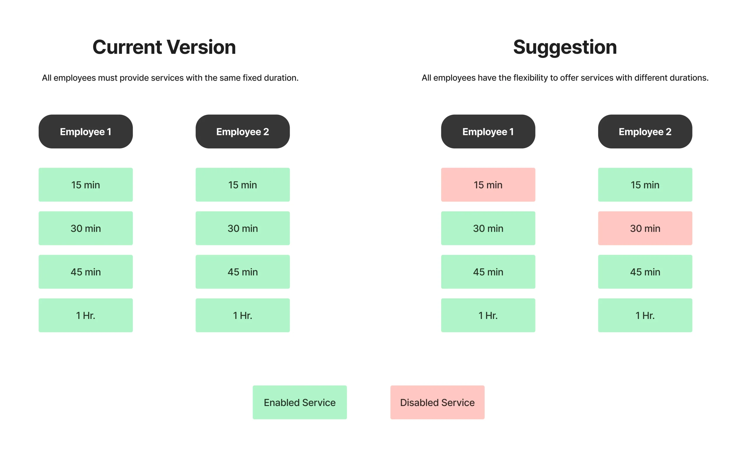 2. Allowing each employee to choose the service duration they want to offer instead of having the same duration for all employees.